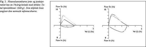 Aflæsning af flowvolumenkurven, ratio MEF 50/MIF 50 og PEF kan støtte vurderingen af øvre luftvejsobstruktion. I vort arbejde var PEF og/eller ratio MEF 50/MIF 50 postoperativt forenelig med aftagende luftvejsobstruktion i 28 tilfælde (85%).
