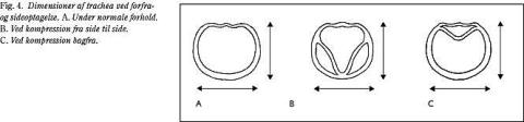 I et større materiale på 51 patienter med struma fandt Geraghty et al (13), at næsten halvdelen havde symptomer på øvre luftvejsobstruktion. Som påvist i vort materiale kan en almindelig røntgenundersøgelse af trachea og thorax ikke i alle tilfælde udelukke en tracheaforsnævring, som kan skyldes en impression af tracheas bageste, membranøse væg eller en impression fra side til side (Fig. 4). Dette er i overensstemmelse med, at otte af 12 af Geraghtys patienter med normal røntgenundersøgelse fik forbedret de postoperative flowvolumenkurver. Han fandt ingen korrelation mellem vægten af gl. thyroidea og de forskellige variable, som kan udledes af flowvolumenkurven, hvilket svarer til resultaterne i vore egne undersøgelser. I lighed med andre (4) vil vi anbefale kirurgisk behandling af patienter med struma og tegn på øvre luftvejsobstruktion frem for behandling med J 131, hvor man i modsætn ing til den kirurgiske behandling ikke har kunnet påvise nogen objektiv bedring i tracheas lumen (6).