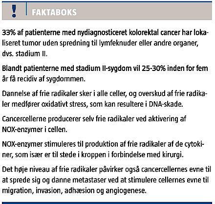 Vores primære kirurgiske behandling og den heraf afledte morbiditet er måske en af grundene til den høje risiko for recidiv i en ellers radikalt behandlet sygdom. Formålet med denne artikel er at sætte fokus på sammenhængen mellem perioperativt udviklet oxidativt stress og risikoen for udvikling af metastaser ved kolorektal cancer.