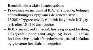 Kronisk obstruktiv lungesygdom (KOL) er årsag til betydelig morbiditet og mortalitet i Danmark og på verdensplan (1, 2). KOL opdeles traditionelt i kronisk bronchitis og emfysem, men blandingsformer ses ofte. Tobaksrygning er årsag til 90% af alle KOL-tilfælde, men kun 15-20% af alle rygere udvikler alvorlig KOL. Årsagerne til forskelle i følsomhed hos de enkelte rygere er ikke klarlagt. α -1-antitrypsin-mangel er foreløbig den eneste kendte disponerende genetiske faktor og har tjent som model for protease-antiprotease-teorien, hvor lungernes elasticitet og funktion påvirkes af nedbrydende enzymer (proteaser), der modreguleres af beskyttende enzymer (antiproteaser) (3, 4). Oxidativt stress er muligvis den udløsende molekylære begivenhed, der fører til ændring af protease-antiprotease-balancen og efterfølgende irreversibel skade på lungeparenkymet. Rygning kan inducere oxidativt stress, og flere studier viser stigning i biomarkører for oxidativt stress hos rygere og patienter med tobaksbetinget KOL (5-7).