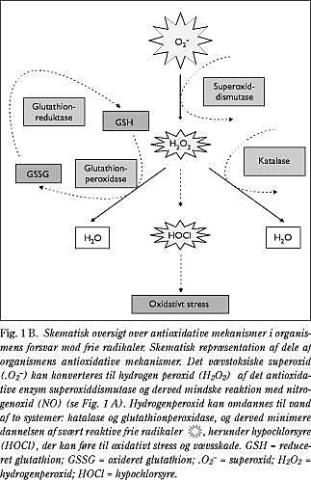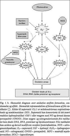 Andre kilder til frie radikaler er nitrogenoxid (NO), der ved reaktion med superoxid O2- danner det særdeles reaktive peroxynitrit (ONOO). Antioxidanten til begrænsning af denne reaktion er igen superoxiddismutase, og organismen har således for hvert potentielt skadeligt frit radikal en reguleringsmekanisme, der kan omdanne stoffet til mindre skadelige substanser (5, 8, 9). Sammenhængene er forenklet beskrevet og vises i Fig. 1A og Fig. 1B .