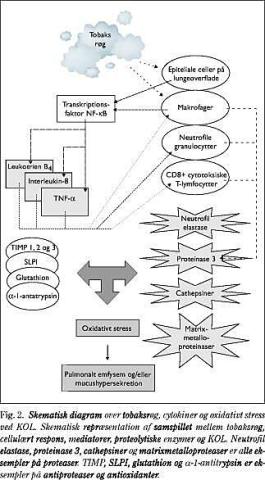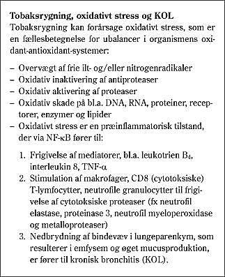 Flere eksperimentelle studier har imidlertid vist, at tobaksrøg indeholder adskillige oxygen- og nitrogenderiverede frie radikaler. Rygere og KOL-patienter udskiller en øget mængde oxidationsprodukter, og niveauet stiger yderligere ved eksacerbation af KOL. Cellulære og enzymatiske antioxidantsystemer hos rygere og KOL-patienter er påvirket i negativ retning, og der er vist en sammenhæng mellem frie radikaler, oxidativt stress og øget inflammationstilstand målt ved CRP, TNF-α o.l. De omtalte metoder bruges primært i videnskabelig sammenhæng, dog er NO og H2 O2 i udåndingskondensat i klinisk brug som markør for luftvejsinflammation i engelsktalende lande. Inflammation er et kritisk punkt i patofysiologien ved KOL, og oxidativt stress synes ved gennemgang af den foreliggende litteratur at være en væsentlig præinflammatorisk komponent. Det er kendt, at α -1-antitrypsin-mangel kombineret med rygning fører til udvikling af pulmonalt emfysem (4). En lignende genetisk betinget mekanisme med nedsat eller manglende funktion af antioxidative forsvarssystemer kan svække den totale antioxidative kapacitet med risiko for vævsskade og herunder udvikling af emfysem. Ved udsættelse for tobaksrøg synes der at være en øget risiko for udvikling af KOL ved genetisk polymorfi af regioner, der koder for antioxidativ funktion. Det er således nærliggende at forestille sig, at varierende funktion af de antioxidative systemer kunne medvirke til at forklare forskelle i følsomhed for tobak ved udvikling af KOL.