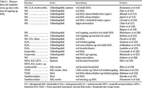 I det følgende omtales biomarkører for oxidativt stress ved KOL, skematisk beskrevet i Tabel 1 . Biomarkører er indirekte mål, da de direkte involverede biologiske substanser er flygtige og behæftet med måleusikkerhed. Det er muligt at måle biomarkører i udåndingsluft, sputum, væske fra bronkoalveolær lavage (BAL) og blod.