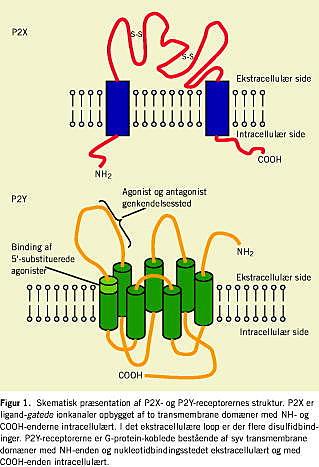 P2Y-receptorerne er G-protein-koblede receptorer, og otte forskellige undertyper er blevet karakteriseret (P2Y1, 2, 4, 6, 11, 12, 13, 14), ligeledes på baggrund af agonisternes potens [6]. Proteinet består af syv transmembrane kæder forbundet ved intra- og ekstracellulære loop (Figur 1). Efter ligandbinding aktiveres inositol 1,4,5-trifosfat (IP3)-systemet. IP3 virker som anden budbringer (second messenger ) og medierer mobilisering af calcium fra intracellulære lagre. Derved opnås der, ligesom for P2X-recptorernes vedkommende, en stigning i den intracellulære calciumkoncentration og en heraf følgende effekt i cellen afhængig af celletype [4, 7]. For P2Y-receptorerne gælder det, modsat for P2X-receptorerne, at der er et længere tidsinterval fra ligandbinding til effekt. Dette skyldes, at P2Y-receptorerne aktiverer den nævnte signalkaskade, som involverer produktion og syntese af second messengers [4].