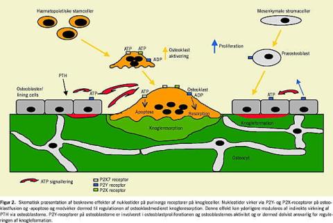 Det fremgår således tydeligt, at der efterhånden foreligger en del studier, som delvist belyser P2-receptorernes rolle i knoglebiologien (Figur 2 ), og ikke mindst i regulationen af såvel knogleformation som -resorption. Efterhånden som vi opnår bedre forståelse for disse receptorers rolle i knogleomsætningen, vil det også være indlysende at udnytte disse effekter ved at søge at udvikle nye knogleaktive medikamenter, som kan vise sig nyttige i behandlingen af metaboliske knoglesygdomme såsom osteoporose, inflammatoriske sygdomme (arthritis rheumatoides og periodontitis) samt tumorinduceret osteolyse. Endelig ville man måske oven i købet kunne forhindre udvikling af knogletab i forbindelse med tab af mekanisk stimulation som følge af micro-gravity . På grund af de forskellige receptorer involveret og de øjensynlige effekter på både knogleformation og resorption har vi her potentialet for udvikling af både antiresorptive og anabole stoffer.
