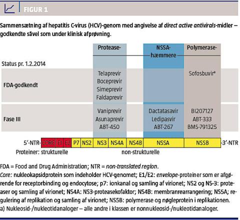 I kombination med PEG-INF/RBV forventes fire nye andengenerations-DAA-midler at blive godkendt til behandling af HCV i Danmark i løbet af 2014. Det drejer sig om proteasehæmmerne simeprevir og faldeprevir, polymerasehæmmeren sofosbuvir og NS5A-hæmmeren daclatasvir. Flere andre DAA-midler er under afprøvning i fase 2- og fase 3-studier og forventes godkendt inden for den nærmeste årrække (Figur 1). Der er flere attraktive egenskaber ved andengenerations-DAA-midlerne. De er karakteriseret ved pan-/multigenotypisk aktivitet (Tabel 1), behandlingen er relativt kortvarig (8-24 uger), og resistensbarrieren er høj. Bivirkningerne er få og milde, bl.a. gastrointestinale gener, hovedpine og træthed [2]. DAA-midlerne administreres peroralt én gang dagligt uden hensyn til fødeindtag og er særdeles potente til opnåelse af SVR. Inden for rammerne af denne statusartikel lader det sig ikke gøre at foretage en detaljeret gennemgang af data fra de mange forskellige kliniske afprøvninger. Her skal det blot konkluderes, at man generelt vil opnå SVR-rater over 90% ved behandling af GT 1-patienter med PEG-INF/RBV plus et andengenerations-DAA-middel [2, 21-24]. Dog har det vist sig, at patienter med cirrose og GT 1-undertype a har lavere SVR-rater. For disse patienters vedkommende vil der formentlig være brug for at behandle med mere potente regimer, der indeholder to forskellige DAA-midler.