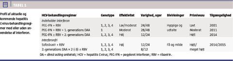 De første af en række af nye og mere effektive DAA-baserede regimer i kombination med PEG-IFN/RBV til behandling af kronisk HCV forventes introduceret i Danmark i løbet 2014. På længere sigt tilstræbes interferonfri behandling af GT 1 med kombination af to eller tre DAA-midler, på tilsvarende vis som kombinationen af sofosbuvir og RBV har vist sig at være effektiv til behandling af patienter med GT 2 og GT 3. Mere end 4.000 registrerede patienter med HCV kandiderer p.t. til antiviral terapi, heraf har halvdelen et påtrængende behandlingsbehov på grund af cirrose eller præcirrose. Endvidere er der et mørketal på flere tusind personer med endnu udiagnosticeret kronisk HCV og deraf følgende risiko for at der udvikles alvorlige leverpatologiske senmanifestationer. Der er i den forbindelse, som det er gjort i USA, brug for en langt mere målrettet HCV-screeningsindsats i Danmark for at identificere disse personer. Ligeledes er der behov for, at vores sundhedspolitiske beslutningstagere forholder sig aktivt til, hvordan patienter med kronisk HCV skal prioriteres rent resursemæssigt. Det skylder vi både patienterne og de behandlere, som skal stå på mål for prioriteringerne.