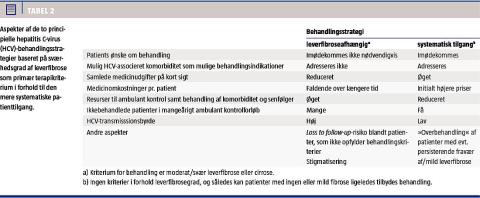 Der er for så vidt behandlingsindikation for alle patienter med kronisk HCV, men i særlig grad for patienter med moderate til svære leverforandringer. Disse udgør 40-50% af den p.t. behandlingsafventende population, svarende til 1.600-2.000 patienter [5]. Man kan ud fra et klinisk synspunkt argumentere for, at patienter med ingen eller mild leverfibrose ikke umiddelbart er behandlingskrævende. Disse patienter vil som konsekvens skulle følges i ambulant kontrolforløb med afventning af yderligere progression i leverpatologien, før de tilbydes behandling. Ved sundhedsøkonomiske beregninger er det dog påvist, at en systematisk behandlingsstrategi er mere omkostningseffektiv end anvendelse af graden af leverfibrose som primærkriterie for valg af terapi [29]. Baggrunden for denne konklusion er, at merprisen pr. quality-adjusted life years ved at behandle alle HCV-inficerede uanset sygdomsstadie er særdeles lav selv med høje estimater for prisen på DAA-midler. Endvidere kan HCV-associeret komorbiditet, såsom diabetes, hjertesygdom og neurokognitiv dysfunktion, understøtte rationalet om en systematisk strategi for behandling af HCV. Endelig er HCV, som det er tilfældet med hiv, ofte behæftet med stigmatisering, hvilket yderligere taler for at efterkomme et behandlingsønske fra patienter med HCV uanset graden af leverpatologi (Tabel 2). Argumentationen for en tidligere og mere systematisk behandlingstilgang kan meget vel understøttes af lavere udgifter og et mindre resurseforbrug, når færre patienter vil skulle følges i et mangeårigt ambulant kontrolforløb, som endvidere kunne indebære en risiko for lost to follow-up og efterfølgende leversenkomplikationer pga. manglende proaktivt behandlingstilbud.