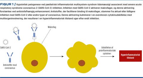 Årsagen til udvikling af PIMS-TS er ukendt, men den samtidige opståen med COVID-19-pandemien og positivitet for SARS-CoV-2 hos langt størstedelen af patienterne rejser flere stærke argumenter for en direkte årsagssammenhæng. Epidemiske kurver viser tydeligt, at fremkomst af PIMS-TS udviser et klimaks 4-6 uger efter klimaks for kurven for COVID-19, hvilket understøtter hypotesen om en direkte årsagssammenhæng, og dette understøttes yderligere af det drastiske fald i forekomsten af PIMS-TS i takt med nedgangen af COVID-19-tilfælde med samme tidsmæssige forsinkelse [25]. Desuden stammer de rapporterede tilfælde af PIMS-TS fra lande, som har været stærkt afficeret af COVID-19, herunder specielt Italien, Frankrig, England og USA. Teorien er derfor, at der kan være tale om en uhensigtsmæssig udvikling af et patologisk immunrespons mod SARS-CoV-2, specielt hos disponerede personer. I denne sammenhæng er det af mulig relevans, at SARS-CoV-2 kan inficere makrofager ved at benytte specifikke cirkulerende antistoffer, der således fungerer som bindeled mellem virus og Fc-receptoren [26], såkaldt antistofafhængig enhancement, hvilket udløser et kraftigt inflammatorisk respons (Figur 1). Antistoffer mod tidligere coronavirusstammer eller SARS-CoV-2 fra nylig overstået infektion kan således udløse og/eller øge risikoen for denne postinfektiøse immunpatologiske tilstand. Det har desuden været foreslået, at PIMS-TS kunne være relateret til toxic shock syndrome på basis af lighedspunkter mellem SARS-CoV-2 spikeproteinet og superantigener, såsom Staphylococcus enterotoxin B (SEB), og at dette kunne forklare udviklingen af den voldsomme inflammation, der ses i forbindelse med PIMS-TS [27, 28]. Mod denne hypotese taler dog i høj grad det faktum, at PIMS-TS først observeres flere uger efter maksimum i virusload og spikeprotein, idet man i tilfælde af en mekanisme, som involverer superantigen, ville forvente at se inflammation udviklet samtidig eller umiddelbart efter infektionen. I en helt ny publikation præsenteres den til dato mest detaljerede beskrivelse af immunologien ved PIMS-TS i et studie, hvor man sammenligner det immunologiske respons hos børn med akut SARS-CoV-2-infektion, KS og PIMS-TS [30]. Studiet finder forskelle i hyperinflammation ved PIMS-TS i forhold til akut COVID-19, og der beskrives distinkte forskelle i T-celle-subsets, hvor specielt IL-17A er vigtig ved KS, men ikke ved PIMS-TS, og endelig beskrives specifikke autoantistoffer med patogent potentiale hos patienter med PIMS-TS [30].