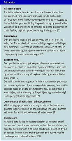En del af de terminalt syge patienter har så svær symptomatologi, at de har behov for en specialiseret tværfaglig behandling. Den palliative indsats i Danmark er inddelt i et basisniveau og et ekspertniveau, som beskrevet i Sundhedsstyrelsens Kræftplan 2 [7]. Primærsektoren, de praktiserende læger og hjemmesygeplejerskerne udgør således ikke bare det basale niveau i den palliative indsats i hjemmet, men forventes også at spille en vigtig rolle på ekspertniveau sammen med et specialiseret palliativt team. Alligevel er der meget, der tyder på, at de praktiserende læger indimellem shuntes ud eller føler sig shuntet ud af de palliative forløb i hjemmet, som det også er beskrevet i Sundhedsstyrelsens »Hospice uden mure« fra 2005 [8]. Med indførelsen af specialiserede team og hospicer er der kommet en tiltrængt mulighed for, at patienter kan få sufficient behandling på specialistniveau. Desværre er der også en fare for, at alle palliative patienter skubbes hen imod den specialiserede indsats med kapacitets- og flaskehalsproblemer til følge. Man risikerer herudover at miste de patient- og pårørendeoplevede relationelle kvaliteter, som knytter sig til samarbejdet med egen læge og hjemmeplejen.