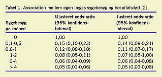 I helt nye epidemiologiske studier af et dansk materiale har man påvist, at blot et enkelt hjemmebesøg af egen læge i de sidste tre levemåneder femdobler oddsene for at dø hjemme i stedet for at dø på hospital. Desuden stiger oddsene for hjemmedød proportionalt med antallet af hjemmebesøg (Tabel 1 ) [2]. Disse resultater kan tolkes, som om den praktiserende læge har en betydningsfuld rolle i hjemmene. Patienter og pårørende værdsætter da også den praktiserende læges samlede palliative indsats, og det ser ud til, at den tætte læge-patient-relation er vigtigere for patienter og pårørende end maksimal symptomkontrol [3]. I flere undersøgelser har man desuden påvist, at de praktiserende læger i høj grad ønsker at være aktive i den palliative indsats, men at der er behov for undervisning, supervision og kvalitetssikring [4].