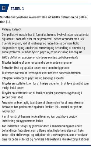 Historisk har palliativ indsats både organisatorisk og klinisk været rettet mod patienter med kræft, men det ændrer sig både internationalt og nationalt i disse år. Af Sundhedsstyrelsens anbefalinger fra 2017 for palliativ indsats fremgår det, at palliation er for alle patienter og familier, der er ramt af livstruende sygdom, og det bør tilbydes allerede fra diagnosetidspunktet [1]. Anbefalingerne bygger på WHO’s definition af palliation (Tabel 1). Behovet for palliativ indsats hos bl.a. patienter med livstruende medicinsk organsvigt anerkendes og dokumenteres i stigende grad.
