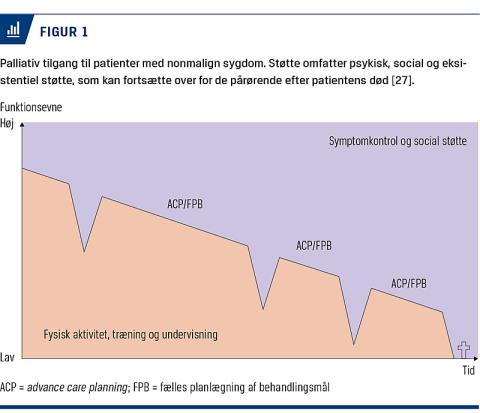 Patienter med livstruende medicinsk organsvigtssygdom har, med baggrund i symptombyrde og mortalitet, behov for en palliativ indsats på lige fod med patienter med kræft. Flere studier tyder på et sammenfald i hyppighed og sværhedsgrad af symptomer, uanset grundsygdom, herunder åndenød, fatigue, smerter, anoreksi, angst og depression [15-17]. For patienter med medicinsk organsvigt er mortaliteten høj og sammenlignelig med dødeligheden ved en række kræftsygdomme [18, 19]. På tværs af diagnoser kan en rettidig planlægning i form af advance care planning (ACP) være en forudsætning for et godt forløb [20], hvor afklaring vedrørende behandlingsplan og behandlingsstop sker i god tid og kontinuerligt [21].