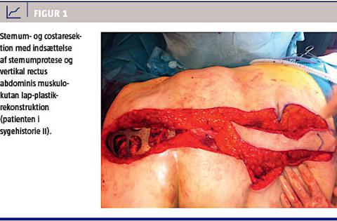 II. En 58-årig kvinde med invasivt duktalt karcinom blev i 2003 mastektomeret med aksilrømning på venstre side. I marts 2010 henvendte hun sig pga. smerter i sternum under cikatricen. Der bliver foretaget computertomografi, der viste et isoleret recidiv i sternum ved cikatricen. Patienten påbegyndte kemoterapi, som dog blev seponeret efter alvorlige bivirkninger. Da hun fortsat havde smerter, blev hun tilbudt et palliativt kirurgisk indgreb med resektion af øverste del af sternum, anlæggelse af en sternumprotese og efterfølgende rekonstruktion med en vertikal rectus abdominis muskulokutan lap-plastik (Figur 1). Patienten blev udskrevet efter ti dage, men genindlagt senere med overfladisk partiel nekrose i lappen, hvilket blev behandlet med et delhudstransplantat. Hun blev derefter fulgt i onkologisk regi.