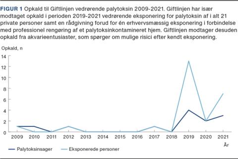 Symptomerne hos patienterne i sygehistorierne debuterede 30-60 min efter den formodede eksponering. Patienten i sygehistorie I stod direkte over vandaerosolerne og fik betydelig respiratorisk påvirkning. Patienten i sygehistorie II befandt sig få meter fra eksponeringskilden, mens patienten i sygehistorie III befandt sig i gulvhøjde i samme rum og fik de mildeste symptomer. Variationen i symptomgraden, der afhang af afstanden til eksponeringskilden, svarer til den i litteraturen beskrevne dosis-respons-sammenhæng [1, 3], og symptomerne var forenelige med palytoksinforgiftning, på trods af at eksponeringen ikke blev verificeret med biologiske prøver. Øvrige årsager til symptomerne blev udelukket. Giftlinjen har observeret en stigning i opkald vedrørende palytoksinforgiftning i private hjem (Figur 1), hvilket antages at skyldes en øget tilgængelighed af palytoksin via den udbredte internethandel. Nationale retningslinjer med sikkerhedsforanstaltninger ved håndtering af saltvandsakvarier kan udbrede viden om risici og forebygge forgiftninger, særligt til gavn for børn og gravide, hvis fostre undergår kritiske udviklingstrin.
