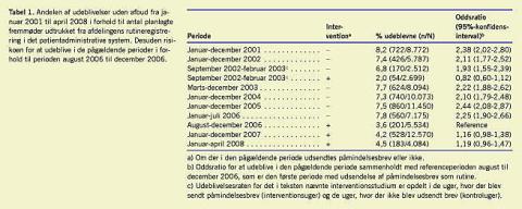I Tabel 1 ses antallet af udeblivelser i forhold til det antal bookninger, der på selve ambulatoriedagen var registreret i GS. Udeblivelsesraten for de perioder, hvor der ikke blev udsendt breve, var 2,11 til 2,44 gange højere, end i første periode efter at brevet indførtes som rutine (1. august til 31. december 2006). Idet perioden for den tidligere gennemførte randomiserede undersøgelse ikke medtages, var der fra januar 2001 til juli 2006, da påmindelsesbrevene indførtes, samlet 3.932 udeblivelser ud af 51.351 bookede tider, hvilket svarer til en udeblivelsesfrekvens på 7,7%. Dette faldt til 912 udeblivelser ud af 22.190 bookede tider i perioden 1. august 2006 til 30. april 2008 (oddsratio (OR) = 1,93 (1,80-2,08), p < 0,0001), hvilket svarer til en udeblivelsesfrekvens på 4,1%. Antallet af udeblivelser faldt således fra 77 til 41 pr. 1.000 bookede tider, hvilket svarer til, at der for hver 1.000 bookede tider blev afværget 36 udeblivelser i ambulatoriet. Efter indførelse af påmindelsesbrevet har der været en ikkesignifikant reduktion i effekten, idet antallet af udeblivelser er øget fra 3,6% i 2006 til 4,2% i 2007 og endelig til 4,5% i 2008 (test for trend: p = 0,087)(Tabel 1).