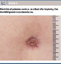 En 77-årig mand i god almentilstand havde gennem et halvt år haft irritation i navlen. Tilstanden var begyndt med rødme, og der var efterhånden udviklet en egentlig blomkålslignende tumor (Figur 1). Han blev henvist til en dermatolog, som biopterede fra forandringen og påviste adenokarcinommetastase. En immunhistokemisk undersøgelse tydede på en primærtumor, som udgik fra den øvre gastrointestinalkanal, inklusive galdeveje og pancreas. Patienten blev herefter henvist til en akutafdeling mhp. videre udredning. CT af thorax, abdomen og bækken rejste mistanke om en tumor i pylorusregionen på grund af en fortykket væg, der var ujævnt kontureret. Desuden blev der set en lille mængde ascites. Patienten var en måned tidligere blevet gastro- og koloskoperet pga. colonpolypkontrol og uspecifikke øvre abdominalsmerter. Fraset divertikler i sigmoideum viste begge normale forhold. På mistanke om linitis plastica blev der foretaget en ny gastroskopi med dybe randombiopsier, alle viste normale forhold. Blodprøver viste anæmi, hæmoglobinniveau 7,7 mmol/l ved indlæggelsen og, som noget nyt, stigende alaninaminotransferaseniveau til 255 E/l og basisk fosfatase til 344 E/l, begge var normale tre dage tidligere. En MR-skanning gav mistanke om Klatskintumor. Desuden fandt man en 2,5 cm stor malignsuspekt forandring i corpus pancreatis med bagvedliggende let dilatation af pancreasgangen. Billederne blev vurderet på en multidisciplinær konference, og det kunne ikke afgøres, om der var tale om en primær Klatskintumor eller en primær pancreascancer. Man vurderede, at pallierende kemoterapi i form af gemcitabin ville være den bedste behandling på grund af en formodet pancreascancer. Det forblev uvist, hvad der var den primære cancer.