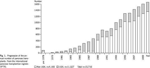 Pancreastransplantation blev udviklet for mere end 35 år siden i et forsøg på at forbedre behandlingen af patienter med diabetes mellitus og uræmi som følge af diabetisk nefropati. De første transplantationer blev udført i Minneapolis i 1966 [1]. Patienterne var oftest belastet med svære sekundære sendiabetiske komplikationer, dette sammenholdt med betydelige tekniske problemer samt insufficient immunosuppression medførte, at resultaterne af pancreastransplantation var dårlige. Trods forbedringer af de kirurgiske teknikker, mere effektiv immunosuppression og bedre patientselektion blev pancreastransplantation længe anset for at være en eksperimentel behandling. Transplantation er imidlertid den eneste behandling, som fører til insulinuafhængig normoglykæmi, og resultaterne er blevet betydeligt forbedret i løbet af de seneste ca. ti år. Dette har medført, at pancreastransplantation i USA betragtes som en behandlingsmulighed for ethvert stadie af diabetes mellitus type 1 [2], og som det ses på Fig. 1 , udføres der årligt ca. 1.400 pancreastransplantationer. I Europa er aktiviteten noget mindre, men specielt i de seneste 3-4 år er antallet steget, således at der nu udføres ca. 2.000 pancreastransplantationer årligt i verden (Fig. 1) [3]. Sammen med lungetransplantation er pancreastransplantation den transplanta-tionstype, som er øget mest i antal i de seneste år. I Danmark er der ikke udført pancreastransplantationer siden 1991. Resultaterne af de danske transplantationer var på linje med internationale resultater, der som nævnt var betydelig dårligere end de nuværende resultater. De markant forbedrede resultater gennem de seneste ti år gør, at man efter vores mening på ny bør tilbyde danske patienter med diabetisk betinget uræmi transplantation af pancreas, enten i forbindelse med eller efter en vellykket nyretransplantation.