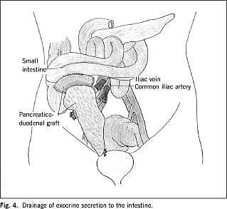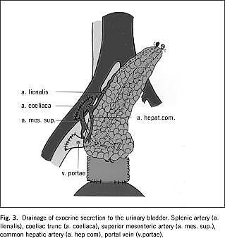 Pancreastransplantation kan udføres ved hjælp af et antal kirurgiske teknikker og procedurer. Hele pancreas eller et segment af pancreas kan transplanteres. Ved anvendelse af levende donor er anvendelse af pancreassegment naturligvis obligatorisk. Håndteringen af den eksokrine sekretion fra kirtlen er en kritisk faktor. Principielt kan man anvende en af tre metoder: okklusion af ductus pancreaticus, drænage til blæren eller drænage til tarmen [1]. Duktokklusion med et polymer forhindrer eksokrin sekretion, men med denne metode er det ikke muligt at monitorere koncentrationen af amylase som en markør for rejektion. Den vigtigste ulempe ved duktokklusion er dog, at en del patienter får tiltagende tab af graftfunktionen som følge af tiltagende fibrosering af graften. Drænage til blæren (Fig. 3 ) har hidtil været den hyppigst anvendte metode, men enterisk drænage (Fig. 4 ) anvendes med stigende hyppighed [7]. Ulemperne ved blæredrænagen er specielt problemer med urinvejsinfektioner og acidose pga. tab af bicarbonat, som udskilles med den eksokrine sekretion. Også drænagen af den endokrine sekretion kan foretages enten til det systemiske kredsløb eller til portalsystemet. Den mest fysiologiske måde er, at blod fra pancreasgraften dræneres til portalsystemet. Denne metode anbefales af flere [15-17]. Den hyppigst anvendte metode er dog fortsat afløb til det systemiske kredsløb, og for nuværende kan man ikke sige, at der er sikkert belæg for at foretrække den ene metode for den anden.