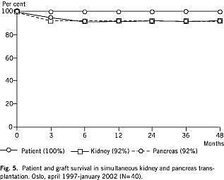 I flere rapporter har man vist, at patienter, som har fået foretaget kombineret nyre-pancreas-transplantation, har bedre langtidsoverlevelse end diabetikere, som kun har fået foretaget nyretransplantation. Denne forskel er mest udtalt, hvis man sammenligner patienter, som har fået en nyre fra en nekrodonor [27-29]; men også hos recipienter af en nyre fra en levende donor er der påvist højere overlevelsesrate [30].