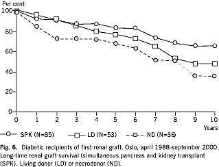 Der er ikke foretaget randomiserede studier, og gevinsten ved en pancreastransplantation er dermed vanskelig at definere klart. Det nærmeste, man kommer et randomiseret studie, er et arbejde fra Stockholm [31], hvor en gruppe bestod af personer, som var tiltænkt en kombineret nyre-pancreas-transplantation, men som af den ene eller anden årsag kun fik en nyre, samt patienter, som mistede deres pancreas i løbet af kort tid. Resultaterne i denne gruppe blev sammenlignet med resultaterne hos patienterne, som fik foretaget SPK. Dette arbejde viste, at patienter med en fungerende pancreasgraft i mere end to år havde en klart højere langtidsoverlevelse. Tiårsoverlevelsen var 80% mod 20% i gruppen, som kun fik en nyre. I Fig. 6 vises resultaterne fra Oslo, hvor langtidsoverlevelse for SPK-patienter er sammenlignet med langtidsoverlevelse for aldersmatchede diabetikere, som i samme tidsrum alene fik en nyre fra en nekrodonor eller fra en levende donor. Sidstnævnte gruppe repræsenterer en positiv selektion i form af lav alder, kortere varighed af diabetes og en højere andel af patienter transplanteret i prædialytisk stadium. Alligevel er overlevelsen bedre hos patienter, som fik foretaget en kombineret nyre-pancreas-transplantation.