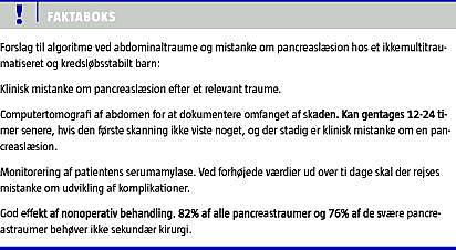 Summary Pancreatic trauma in children - operative versus non-operative treatment - a systematic review Ugeskr Læger 2012;174(3):115-119 Pancreatic trauma is more frequent in children than in adults and is often caused by trauma to the upper part of the abdomen. Mortality is low, but morbidity is high. Pancreatic trauma can be treated operatively or non-operatively, but there is disagreement about the optimal treatment strategy for patients with severe pancreatic lesions. In general, good results are achieved with non-operative treatment and secondary surgery is avoided, but prospective trials are needed to evaluate the method.