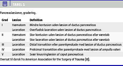 Pancreastraumer kan graderes efter sværhedsgrad, hvilket har betydning for prognosen og behandlingen [8]. American Association for the Surgery of Trauma (AAST) inddeler pancreastraumer i fem grader (I-V). Grad I-II betegnes som lette læsioner og er uden læsion af ductus pancreaticus, hvorimod grad III-V betegnes som svære læsioner med læsion af ductus pancreaticus (Tabel 1 ).