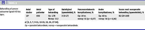 Tabel 2 indeholder de studier, hvor der redegøres for resultaterne af operativ og nonoperativ behandling af stumpe pancreastraumer hos børn. Succesraten for nonoperativ behandling er defineret som antallet af de patienter, hvor der primært er behandlet konservativt, og hvor senere operativ behandling ikke var nødvendig. Resultaterne i tabellen stammer fra 19 studier, men for at overskueliggøre resultatet er hvert enkelt studie ikke vist. Det ældste studie er fra 1988, det nyeste er fra 2010. Studierne repræsenterer et bredt udsnit af lande fra Europa, Nordamerika, Asien, Australien og Afrika. I det mindste studie er der inkluderet syv patienter, og i det største er der inkluderet 173 patienter. Det var i visse studier ikke muligt at ekstrahere data på alle parametre. Pancreasrelateret morbiditet dækker over pancreaspseudocyster, pan-kreatitis og pancreasfistler.