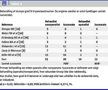 Dødeligheden efter pancreastraumer i de inkluderede studier var generelt lav (ca. 3%) og kan ikke direkte associeres til pancreaslæsionen, men til skader på de store blodkar, multiorganskade eller svære hovedtraumer. Den pancreasrelaterede morbiditet var derimod forholdsvis høj, og der var en nonsigni-fikant tendens til højere morbiditet blandt de nonoperativt behandlede (55%) end blandt de operativt behandlede (19%) (RR = 1,72; 95% KI: 0,96-3,08; p = 0,07) (Tabel 2).