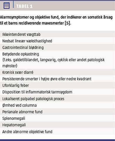 Mavesmerter optræder hyppigt hos børn. Recidiverende mavesmerter (RAP) forekommer med en prævalens på 8,4% og varierer mellem 0,3% og 19% alt efter definition og barnets alder [1]. Uselekteret er 90-95% af tilfældene uden kendt ætiologi [2]. En række alarmsymptomer skal henlede opmærksomheden på somatisk sygdom som årsag til mavesmerter (Tabel 1).