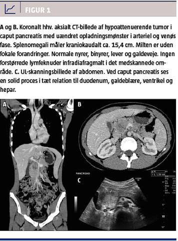 Ved indlæggelsen var pigen upåvirket. Det eneste abnorme objektive fund var palpationsømhed under venstre kurvatur. Blodprøver viste normalt C-reaktivt proteinniveau og leukocytniveau samt normale leverparametre og negativ monospot undersøgelse. En UL-skanning af abdomen viste en ca. 3 × 4 × 5 cm delvis solid og cystisk proces i caput pancreatis (Figur 1). Ved en CT sås der splenomegali, og processen havde tæt relation til duodenum, galdeblære, ventrikel og hepar. En biopsi afslørede en solid pseudopapillær pancreastumor med få mitoser. En kombineret PET/CT viste ingen tegn på spredning af tumoren. Pigen blev pankreatikoduodenektomret ved et ukompliceret indgreb.
