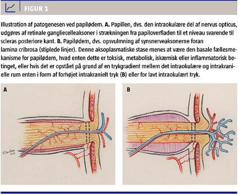 Papilødem fremkommer, når den normale aksoplasmatiske transport i synsnerven i retningen øje-hjerne forhindres, hvorved de enkelte aksoner i papillen svulmer op (Figur 1) [1]. Betegnelsen papilødem er således misvisende, og et egentligt interstitielt ødem som følge af væskelækage er kun sjældent til stede, hvilket underbygges af eksperimentelle dyrestudier [1-3].
