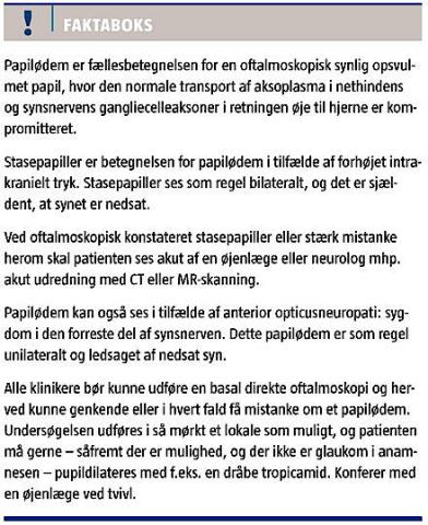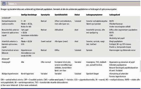 Ved mistanke om papilødem, er det vigtigt, og en god differentialdiagnostisk hjælp, altid at oftalmoskopere begge øjne (Tabel 1).