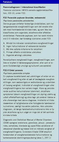 I 1921 fandt man hos Kraepelin [15] omsider et selvstændigt paranoiabegreb kendetegnet ved gradvis udvikling af et system af vedvarende vrangforestillinger hidrørende fra »indre årsager«, men med bevaret tænkning, vilje og handlekraft og i reglen uden hallucinationer, hvor psykiske stressorer måske nok kan præge paranoiaens tema, men ikke initiere dens udbrud. Efter Kraepelin har selve paranoiabegrebet i det væsentlige ligget fast, jf. ICD-10, men s dog andre betegnelser for samme symptomatologi er blevet introduceret, herunder benævnelsen delusional disorder [16]. Også den amerikanske psykiatriorganisation, APA's Diagnostic and Statistical Manual of Mental Disorders, version 4 (DSM-IV) [17] anvender betegnelsen delusional disorder.