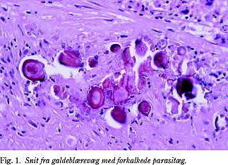 Summary Parasitic gall bladder infection. Ugeskr Læger 2002; 164: 64-5. In two cases of cholecystectomy for gall bladder calculi, the histological diagnoses were inflammation, fibrosis, and numerous calcified parasite eggs in the wall of the gall bladder, compatible with eggs from the liver fluke, which can infect humans who eat raw or undercooked fresh water fish (sushi!).
