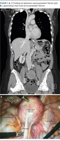 Otte år senere blev hun indlagt akut i gastrokirurgisk regi pga. diffuse smerter i nedre abdomen. Ved CT fandt man en proces på 5 × 7 cm foran os sacrum med formodet udgangspunkt i højre ovarium (Figur 1A). Hun blev derfor henvist til en gynækologisk afdeling, hvor man ved UL-skanning fandt et normalt højre ovarium, men fik fornemmelse af en vaskulariseret stilk fra højre ovarium til en 5 × 4,7 × 5,5 cm stor fibromlignende proces. Venstre ovarium så naturligt ud. Cancerantigen-125 blev målt til 19 kE/l (normalværdi: < 35 kE/l). Smerterne gik i ro, og hun blev udskrevet til ambulant kontrol tre uger senere, hvor hun fortsat var generet af mavesmerter og oppustethed. Der blev foretaget MR-skanning af genitalia interna, hvor man genfandt en solid velafgrænset struktur på 5 × 7 cm beliggende i højre side af det lille bækken adskilt fra ovarier og kar. Hun blev tilbudt laparoskopisk fjernelse, hvor man fandt normale ovarier, men en fibromlignende struktur på 5 × 5 cm med karforsyning fra området omkring coecum (Figur 1B). Der var ingen relation til højre ovarium, og de øvrige abdominalorganer var normale. Fibromet blev in toto fjernet i pose gennem en udvidet incision i venstre fossa iliaca. Operationen forløb ukompliceret, og hun var efterfølgende symptomfri. Histologisk undersøgelse viste leiomyom uden tegn til malignitet.