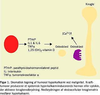 Hyperkalkæmi ses relativt hyppigt ved maligne sygdomme, idet 10-20% af alle patienter med maligne sygdomme vil få hyperkalkæmi under sygdomsforløbet. Incidensen er ca. 150 pr. mio. pr. år i befolkningen. Patofysiologien er ofte kompleks, idet der dels kan være tale om, at den maligne proces direkte påvirker skelettet (f.eks. metastaser og myelomatose), dels at tumorvævet producerer humorale faktorer, der udløser hyperkalkæmi gennem påvirkning af forskellige homøostatiske mekanismer. Humoral hyperkalkæmi ved malignitet (HHM) defineres som et klinisk syndrom karakteriseret ved, at en malign tumor forårsager hyperkalkæmi ved produktion og frigørelse af et hormon eller et cytokin. HHM er således en del af det paraneoplastiske syndrom. I mange tilfælde udløses hyperkalkæmien af en kombination af knoglemetastaser og humorale faktorer. Klinisk kan der afhængig af de udløsende faktorer være tale om såvel hurtig progredierende dysækvilibriumhyperkalkæmi med dehydrering og aftagende nyrefunktion som stabil ækvilibriumhyperkalkæmi. HHM kan være betinget af parathyroideahormonrelateret peptid (PTHrP) og i sjældnere tilfælde af 1,25 (OH)2 -vitamin D eller cytokiner (interleukin 1 (IL1) og interleukin 6 (IL6), tumornekrosefaktor α (TNFα) og prostaglandiner) samt i enkelte tilfælde af ektopisk sekretion af parathyroideahormon (PTH) (Figur 1 ).