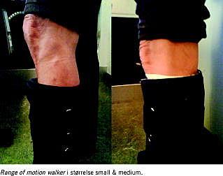 Som det fremgår af figuren, er der forskel på, hvor langt op på crus bandagen når afhængig af størrelsen på den valgte ROM-walker . Ved en walker , der når for langt proksimalt, er der mulighed for uhensigtsmæssigt kompression af n. peroneus communis, idet nerven på dette sted er beliggende superficielt. En walker er konstrueret med polstring mod huden samt med kraftige metalplader lateralt og medialt langs crus. Den fæstnes med velcrobånd, så den kan tilpasses individuelt.
