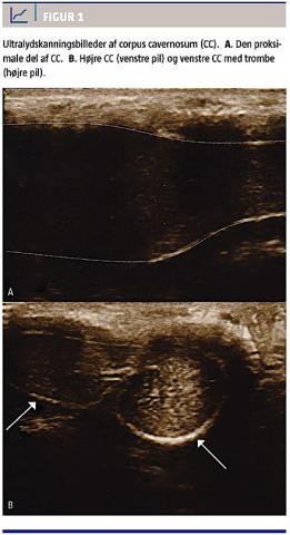 (Figur 1). Ved den distale afgrænsning af dette område kunne der ses en trombose. Ved en CT to måneder tidligere havde man ikke i det lille bækken påvist tumorer, som kunne afklemme det venøse tilbageløb. Patienten kunne smertedækkes sufficient med paracetamol og tramadol og blev sat i behandling med lavmolekylært heparin (LMWH) 12.500 IE en gang dagligt i tre måneder med henblik på opløsning af trombosen. Ved kontrol ti uger efter påbegyndelsen af af LMWH-behandlingen var den partielle erektion væk, ligesom ømhed og smerter var forsvundet. Patienten havde i årevis lidt af komplet erektil dysfunktion, hvorfor den erektile funktion efter endt behandling ikke kunne vurderes.