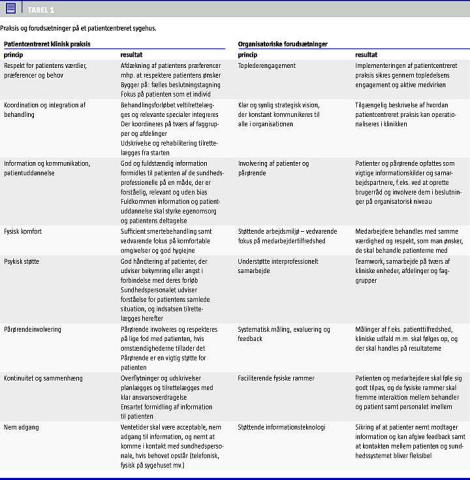 På et stigende antal hospitaler - i særdeleshed i USA - arbejder man strategisk og dedikeret frem mod at nå målet om patientcentreret praksis i alle dens dimensioner. Dana-Faber Cancer Institute, Boston, er velkendt herfor [16]. Særlige organisationer er etableret for at bistå hospitaler og andre sundhedsinstitutioner i denne proces, der ses omtalt i litteraturen som en egentlig businessmodel [2]. I empiriske studier, som er foretaget på amerikanske sygehuse, har man belyst erfaringerne blandt sygehusledere, der målrettet har arbejdet med implementering af patientcentreret praksis på sygehuse, hvor det er patienternes og ikke organisationens behov, der er i centrum [6, 15]. Resultaterne identificerer de nødvendige indsatser, der er sammenfattet i Tabel 1. Insatserne er: en vision, som topledelsen dedikeret breder ud i organisationen, involvering af patienter og pårørende i beslutninger, et støttende arbejdsmiljø og systematisk fokus på medarbejdernes tilfredshed samt etablering af interprofessionelt og tværorganisatorisk samarbejde [6, 15]. De fysiske rammer skal fremme partnerskab og samarbejde mellem faggrupper. Dertil kommer en støttende informationsteknologi, der sikrer, at patienten nemt modtager information og har en fleksibel kontakt med sundhedssystemet. Systematisk måling og opfølgning på kvalitetsdata er påkrævet.