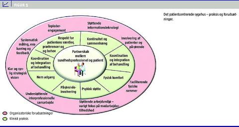 I Figur 1 præsenteres samlet de nødvendige fokusområder for sygehuset. Modellen synliggør, at partnerskab mellem læge og patient er afgørende, og den præsenterer de centrale principper for klinisk praksis samt de nødvendige organisatoriske indsatser.