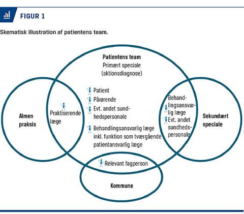 Patientens team er en dynamisk organiserings- og arbejdsform, hvor man organiserer samarbejdet om opgaverne i patientforløbet i et koordinerende netværk (Figur 1). Patientforløbets kompleksitet definerer graden af samarbejde, teamets sammensætning og omfanget af det koordinerende netværk, som patienten er i kontakt med i sit behandlingsforløb, og som arbejder ud fra fælles mål, fælles viden samt gensidig respekt gennem en kommunikation, der understøtter dette. Der kan være fast tilknyttede medlemmer og mere løst tilknyttede medlemmer fra hospitalsvæsenet, den praktiserende læge og fagpersoner i kommunerne. Patient-ens team er kendetegnet ved, at patienten og evt. pårørende er en aktiv del af teamet i den udstrækning, de kan og ønsker det. Patienten sætter dagsordenen i forhold til de behov, der skal imødekommes. Patienten og evt. pårørende skal vide, hvem der indgår i patientens team, hvordan teamet kontaktes, og hvem der har det sundhedsfaglige ansvar for patientforløbet og behandlingen.