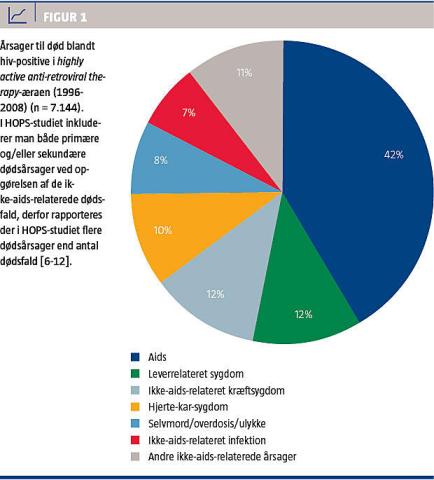 Ulykker/selvmord/stofmisbrug udgjorde 8% af de kendte dødsfald. Selvmord og narkotikaoverdosis var to af de tre hyppigste dødsårsager for patienter, der døde i de første seks måneder af HAART [10]. Samlet set fandt vi, at den velbehandlede hiv-positive population, der er opgjort på godt en kvart mio. personer, i post-HAART-æraen stadig har en betragtelig overdødelighed i forhold til baggrundsbefolkningen med en reduktion i forventet levetid på ca. 16 år [4, 5]. Den hyppigste dødsårsag er fortsat aids, der trods HAART stadig udgør 42%. Herefter følger leverrelaterede dødsfald, ikke-aids-definerende kræftsygdomme, hjerte-kar-sygdomme, selvmord/ulykker/stofmisbrug og ikke-aids-relaterede infektioner. Procentuelt udgør ikke-aids-relaterede årsager en stigende andel af dødsårsagerne sammenlignet med aids.