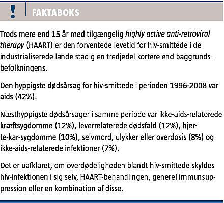 Siden introduktionen af highly active anti-retroviral therapy (HAART) i 1996 er dødeligheden blandt hiv-positive i de industrialiserede lande faldet markant. Således er mortaliteten reduceret med 50% fra præ-HAART-æraen (1994-1995) til sen-HAART-æraen (1998-2002) [1], og der rapporteres fortsat om fald i mortaliteten for hiv-positive med ca. 20% årlig reduktion i aids-relaterede dødsfald [2] og knap 10% årlig reduktion i ikke-aids-relaterede dødsfald, opgjort i perioden 2002-2007 [3].