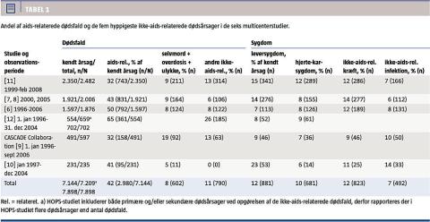 I observationsperioden, 1996-2008, blev der blandt 235.854 hiv-positive personer registreret totalt 7.898 dødsfald, heraf 7.144 med kendt dødsårsag. Af disse var 42% aids-relaterede, og 58% var ikke-aids-relaterede. I alle studierne fandt man en signifikant nedgang i antallet af aids-relaterede dødsfald [6-12]. Det samlede antal aids-relaterede dødsfald og de fem hyppigste ikke-aids-relaterede dødsårsager, der er nævnt i studierne, fremgår af Figur 1, og studierne er individuelt beskrevet i Tabel 1.