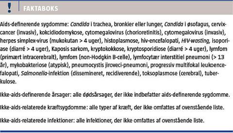Aids var årsag til 42% af de kendte dødsfald. De hyppigste årsager til aids-relateret død var non-Hodgkins lymfom, Cytomegalovirussygdom og Pneumocystis jiroveci-pneumoni, der tilsammen udgjorde 54% af dødsårsagerne [7, 8, 10]. Aids som årsag til død var relateret til alder; således fandt man i to studier, at forekomsten af aids var hyppigere blandt yngre hiv-inficerede [8, 10], mens man i andre to fandt, at risikoen for aids-relateret død steg med alderen [9, 11]. Aids-relateret død var endvidere i alle studier associeret til et lav cluster of differentiation 4-celletal (CD4-tal) og højt hiv-RNA-viral-load målt ved baseline og ved dødstidspunktet [6-12].