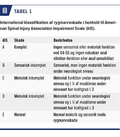 Rygmarvsskade inddeles efter skadens medullære niveau. Betegnelsen tetraplegi bruges om en cervikal læsion, hvor alle fire ekstremiteter er involveret, og paraplegi om en torakal eller lumbal læsion, hvor truncus og underekstremiteterne er involveret [5]. Skaden inddeles i komplet eller inkomplet (Tabel 1) [6].
