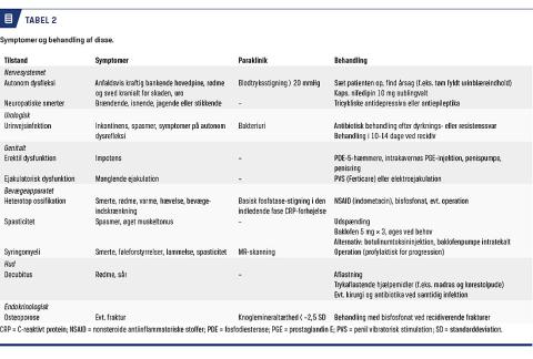 Heterotop ossifikation, som er dannelsen af knoglevæv i bløddelsvæv hyppigst omkring hofte- og knæled, forekommer hyppigt (20%) ved rygmarvsskader. Smerte, rødme, hævelse og bevægeindskrænkning er ofte til stede, før tilstanden kan erkendes radiologisk. Paraklinisk ses forhøjet basisk fosfataseniveau [29]. Se Tabel 2 for behandling heraf. Spasmer er kraftige ufrivillige muskelkontraktioner, som kan udvikles ved en suprasakral læsion. Behand-ling heraf er udspænding og holdningskorrektioner, men medicinsk behandling er oftest nødvendig (Tabel 2) [2].