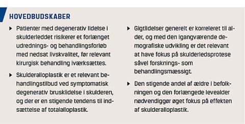 Anvendelsen af alloplastik til degenerative skulderlidelser er under stadig udvikling såvel numerisk som kvalitativt. Den demografiske udvikling i Danmark med stigende levealder og større ældrebefolkning må forventes at give et øget behov for kirurgisk behandling af gigtlidelser, herunder skuldergigtlidelser. Det skal anføres, at eventuel komorbid status er en vigtig parameter ved indikation for kirurgi, men det er vigtigt at pointere, at høj alder ikke i sig selv er en kontraindikation for indsættelse af en skulderprotese [24, 25].