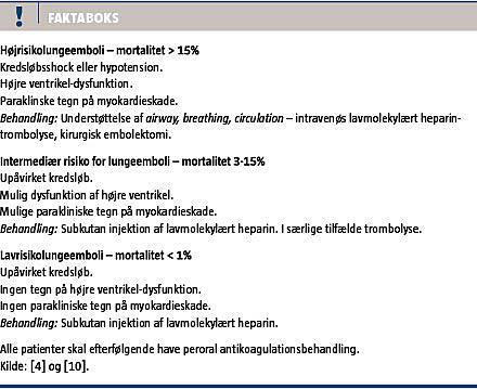 Det skønnes, at 1.500 personer rammes af akut lungeemboli (LE) årligt i Danmark. Det kliniske billede ved akut LE varierer fra lettere åndenød til fulminant kredsløbssvigt og død. Mortaliteten i de første 90 dage efter diagnosen er stillet er for hele populationen på 15-20% [1, 2]. I de sværeste tilfælde er mortaliteten på op til 70% inden for den første time, og 90-dages-mortaliteten for dem, som overlever den første time, er på 50% [3, 4].